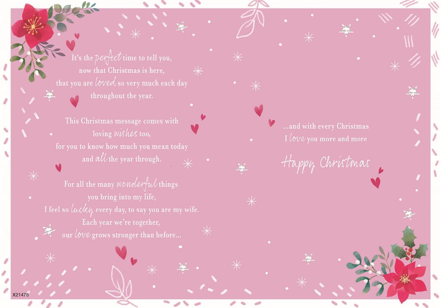 | Verse: | It's the perfect time to tell you, now that Christmas is here, that you are loved so very much each day throughout the year. This Christmas message comes with loving wishes too, for you to know how much you mean today and all year through. For all the many wonderful things you bring into my life, I feel so lucky every day, to say you are my Wife. Each year we're together, our love grows stronger than before... ...and with every Christmas I love you more and more Happy Christmas |