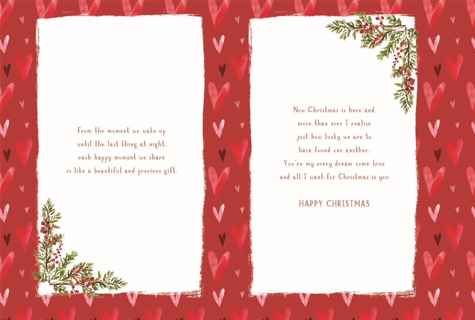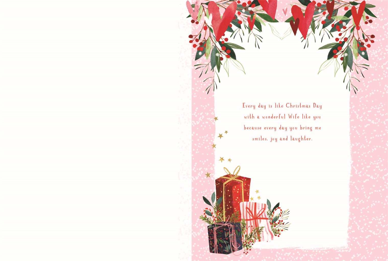 | Verse: | For a beautiful Wife With love at Christmas Every day is like Christmas Day With a wonderful Wife like you Because every day you bring me smiles, joy and laughter. From the moment we wake up Until the last thing at night, Each happy moment we share Is like a beautiful and precious gift. Now Christmas is here and More than ever I realise Just how lucky we are to Have found one another You’re my every dream come true And all I want for Christmas is you Happy Christmas |