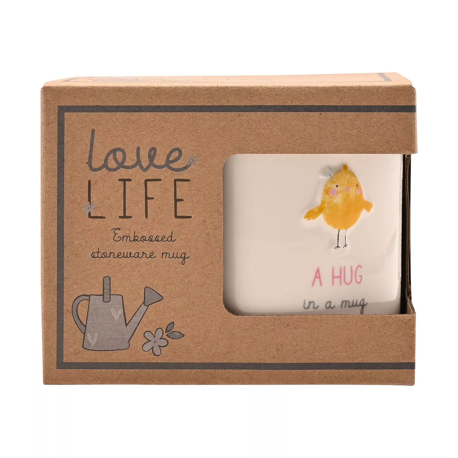 Classic ceramic mug in soft pastel colours with a 3D embossed chick and the words ‘A hug in a mug’ for someone special. In a gift-ready box, this is the ideal everyday mug to add a little sunshine to any home! Suitable for microwave and dishwasher.